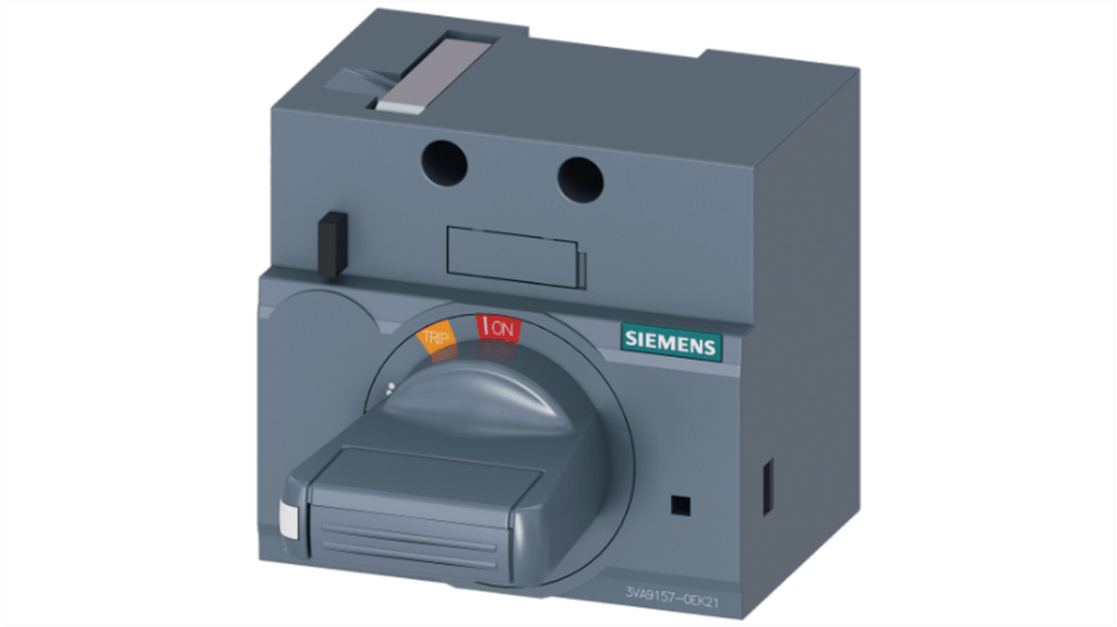 Operatore rotante montato anteriormente per interruttore automatico serie 3VA, blocco interno della porta, colore grigio, protezione IP30, lunghezza 70mm. Prodotto della serie Sentron 3VA9 di Siemens, codice costruttore 3VA9157-0EK21.