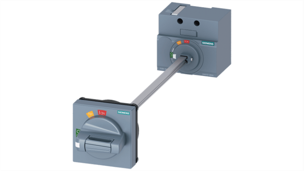 Operatore rotante montato su porta per interruttore automatico serie 3VA. Marchio Siemens, modello 3VA9157-0FK61. Colore grigio, lunghezza 70mm, grado di protezione IP65. Compatibile con 3VA1 100/160. Accessorio della serie Sentron 3VA9.