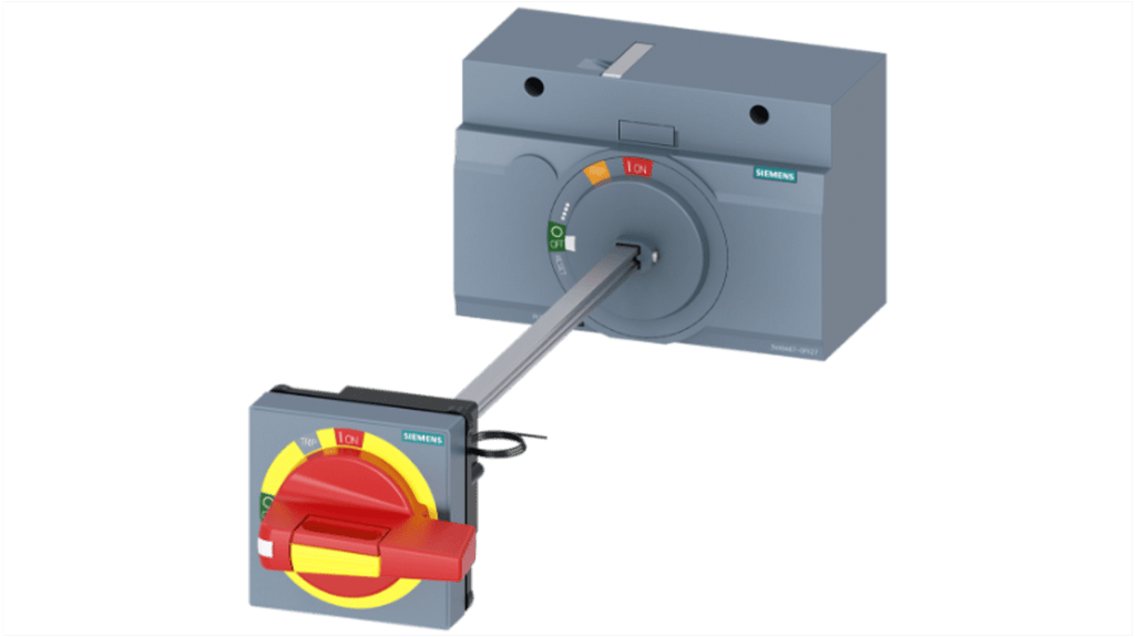 Operatore rotante montato su porta per interruttori automatici serie 3VA. Marchio Siemens, modello 3VA9467-0FK27. Colore grigio, lunghezza 94mm, grado di protezione IP65. Compatibile con 3VA1 400/630 e 3VA2 400/630. Accessorio della serie Sentron 3VA9.