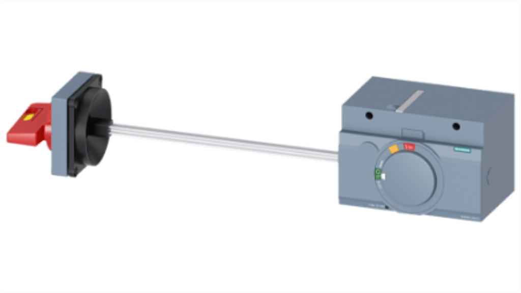 Operatore motore Siemens per interruttori automatici serie 3VA, montaggio a parete laterale, arresto di emergenza. Colore grigio, lunghezza 94mm, grado di protezione IP65. Progettato per modelli 3VA1 400/630 e 3VA2 400/630. Compatibile con la serie SENTRON.