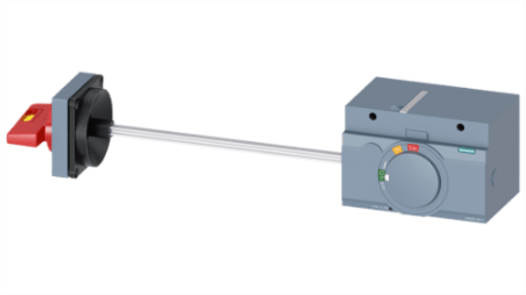 Operatore motore Siemens per interruttori automatici serie 3VA, montaggio a parete laterale, arresto di emergenza. Colore grigio, lunghezza 94mm, grado di protezione IP65. Prodotto della serie Sentron 3VA9, compatibile con modelli 3VA1 400/630 e 3VA2 400/630. Codice costruttore 3VA9467-0PK17.
