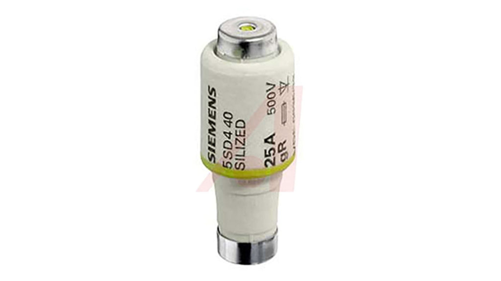 Fusibile a bottiglia Siemens, 25A, filetto E27, fusibile DII, categoria gR, tensione nominale 500V ca/cc, classe di funzionamento gG, conforme agli standard IEC 60269-3 e DIN VDE 0636, temperatura operativa da -5°C a +40°C. Elementi fusibili DIAZED, serie 5SB2. Codice costruttore 5SD440.