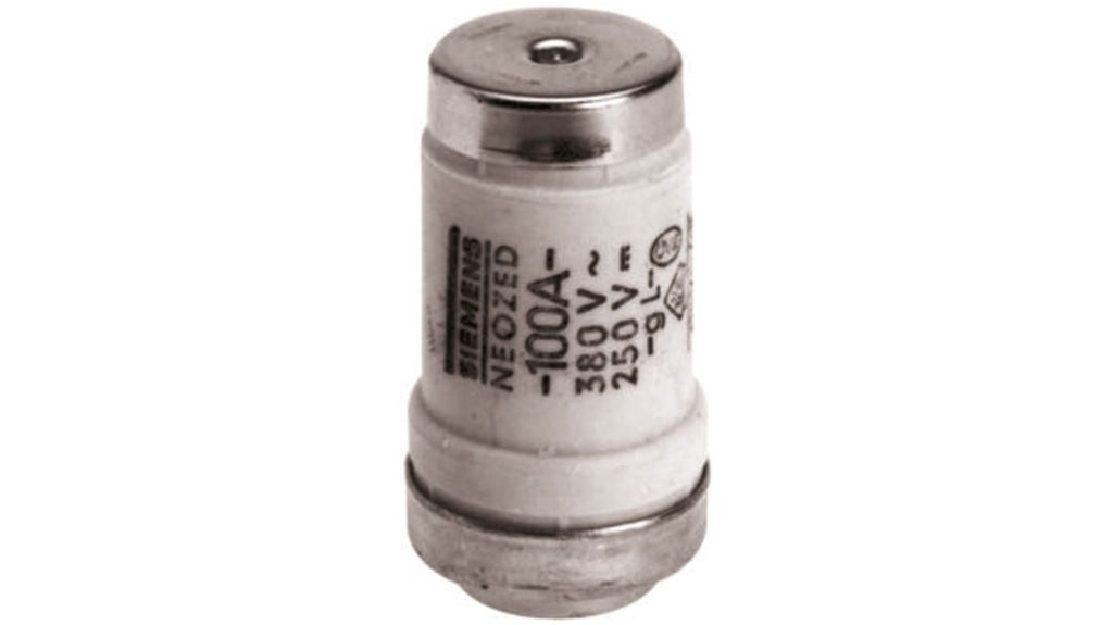 Fusibile Neozed Siemens, 100A, misura D03, tensione nominale 400V ca, capacità di rottura 50 kA a 400V ca e 8 kA a 250V cc, categoria gG, corpo ceramico, indicatore rosso, temperatura operativa da -5°C a +40°C, conforme a DIN VDE 0636-301, IEC 60269-3-1, HD 630.3.1 S3, DIN VDE 0680. Codice costruttore 5SE2300.