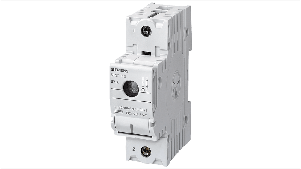 Sezionatore portafusibili a due poli Siemens 5SG7153, corrente massima 63A, fusibile D02 MINIZED, tensione nominale 230 V c.a., grado di protezione IP20, categoria di sovratensione 4, dimensioni fusibile conformi a DIN EN 60269-1. Prodotto integrato, progettato per applicazioni industriali.