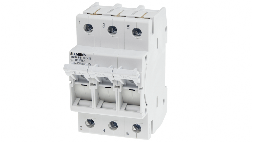 Sezionatore portafusibili Siemens, modello 5SG7631-0KK06, corrente massima 6A, 3 poli, fusibile D01 MINIZED, dispositivo sigillabile, categoria di sovratensione 4. Dimensioni fusibile D01, corrente nominale fusibile 0.3A, serie 5SG.