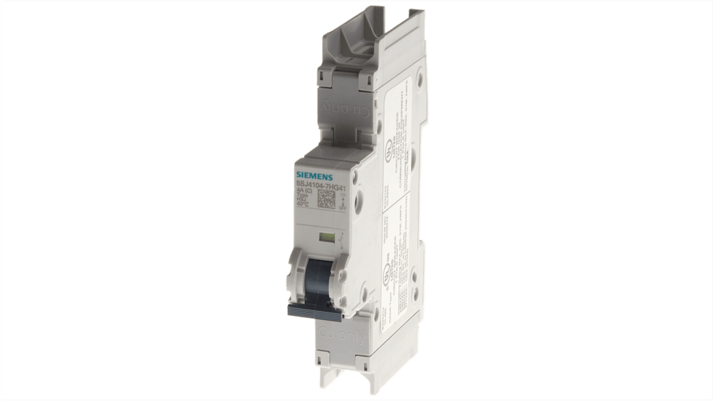 Interruttore magnetotermico Siemens 1P 3A, codice 5SJ4103-8HG41, progettato per interrompere in modo sicuro il circuito e proteggere le installazioni elettriche. Tensione 240 V, capacità di interruzione 14 kA, montaggio su guida DIN. Serie 5SJ, gamma SENTRON, design miniaturizzato, compatibile con accessori per funzioni aggiuntive.