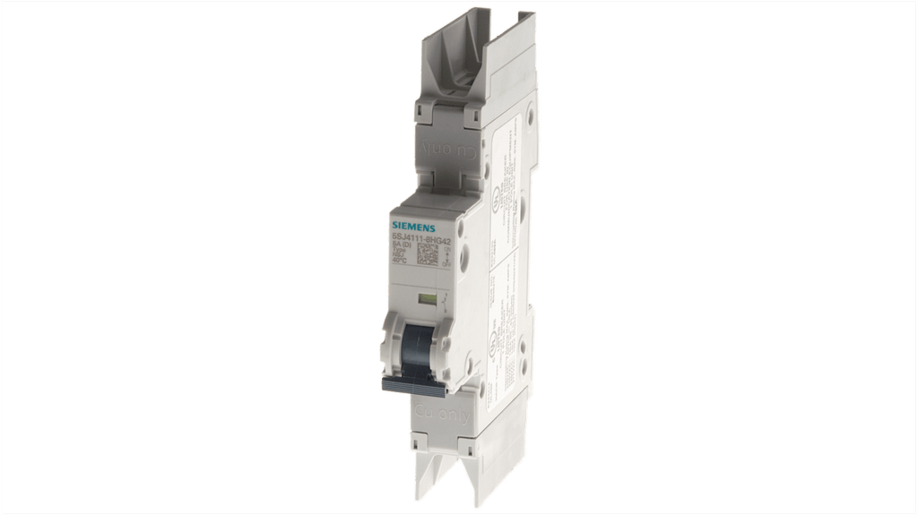 Interruttore magnetotermico Siemens 1P 5A, codice costruttore 5SJ4111-7HG42, progettato per interrompere in modo sicuro il circuito e proteggere le installazioni elettriche. Numero di poli: 1P, amperaggio: 5A, gamma: SENTRON, serie: 5SJ, tipo di montaggio: Montaggio Guida DIN. Conforme a UL 489, capacità di comunicazione e misurazione.