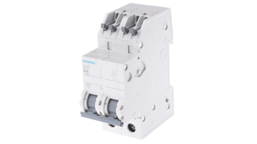 Interruttore magnetotermico automatico, 2 poli, 10A, Tipo B, capacità di rottura 6 kA, tensione nominale c.a. 230V e 400V, tensione nominale c.c. 60V, montaggio su guida DIN, larghezza 36mm, lunghezza 90mm, profondità 76mm, conforme a standard EN 60898, VDE 0641 parte 11, IEC 60898. Utilizzabile in circuiti di connessione e illuminazione.