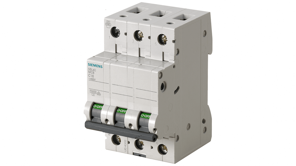 Interruttore magnetotermico Siemens 3P 3A, Tipo B, codice 5SL4303-6. Numero di poli: 3P, amperaggio: 3A, tensione nominale c.a.: 400V, tensione nominale c.c.: 72V. Montaggio su guida DIN, larghezza: 54mm, lunghezza: 90mm, profondità: 76mm. Tipo di contatto terminale: vite. Senza alogeni, sigillabile, senza silicio. Serie SENTRON, tipo d'interruttore automatico: MCB.