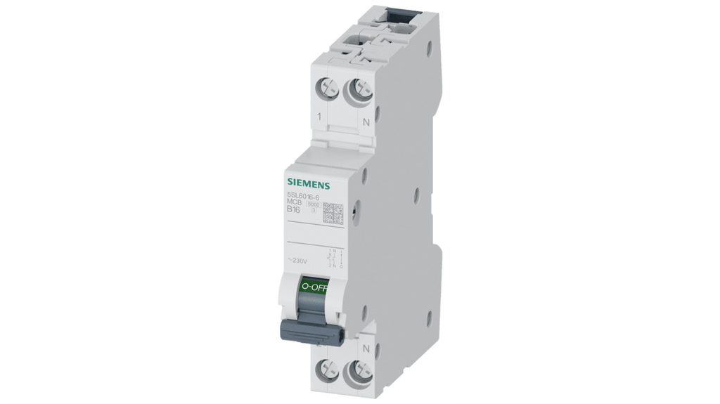 Interruttore magnetotermico unipolare 1P+N, corrente nominale 16A, tensione di alimentazione 230V c.a., capacità di interruzione 6 kA, caratteristica di intervento Tipo B, montaggio su guida DIN, larghezza 18mm, lunghezza 90mm, profondità 76mm, grado di protezione IP20, tipo di contatto terminale a vite, senza alogeni, sigillabile, senza silicone. Codice costruttore 5SL6016-6, marchio Siemens.
