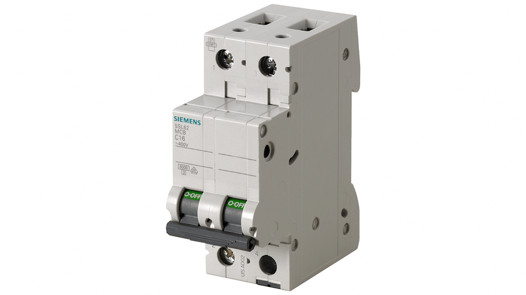 Interruttore magnetotermico Siemens 2P 20A, Tipo B, codice 5SL6220-6. Utilizzato come fusibile per la protezione contro i cortocircuiti. Senza alogeni, sigillabile, senza silicio. Dimensioni: lunghezza 90mm, larghezza 36mm, profondità 76mm. Montaggio su guida DIN. Serie 5SL6, gamma SENTRON, tipo MCB.