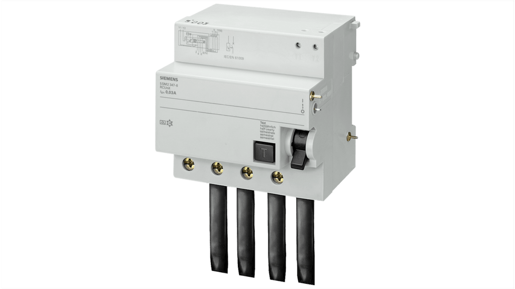 Interruttore magnetotermico Siemens 4P 100A, Tipo A, corrente d'esercizio 100A, tensione di alimentazione 400V, corrente residua di attivazione 300mA, montaggio guida DIN, classe di protezione IP20, senza silicone, compatibile con utilizzatori monofase, dispositivo di corrente residua per protezione da contatto, serie 5SM2, gamma SENTRON.
