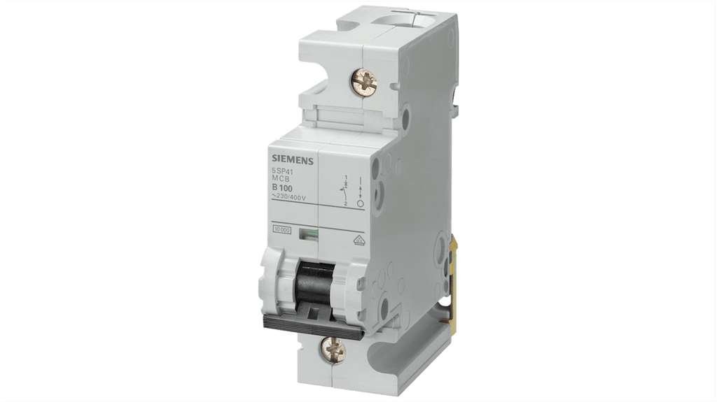 Interruttore magnetotermico Siemens 1P 80A, Tipo C, con capacità di interruzione di corrente di 10kA, tensione nominale 400V, montaggio su guida DIN, larghezza 27mm, lunghezza 90mm, profondità 76mm, tipo di contatto terminale a vite, serie SENTRON, codice costruttore 5SP4180-7. Design miniaturizzato, semplice da installare, protegge circuiti da sovraccarichi e cortocircuiti.