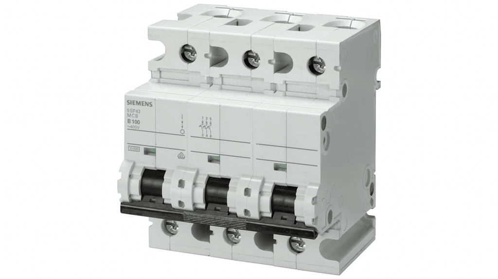 Interruttore magnetotermico Siemens 3 poli 100A, Tipo B, tensione nominale 400V, montaggio su guida DIN, dimensioni 90mm x 81mm x 76mm, senza alogeni, sigillabile, senza silicio, tipo di contatto terminale a vite, serie 5SP4, gamma SENTRON, codice costruttore 5SP4391-6.
