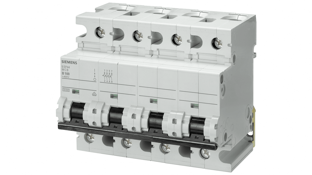 Interruttore magnetotermico a quattro poli, corrente nominale 80 A, tensione di alimentazione 400 V c.a., capacità di interruzione 10 kA, caratteristica di intervento Tipo B. Classe di protezione IP20 con conduttori collegati, IP40 nell'area dell'impugnatura. Montaggio su guida DIN, dimensioni 90 mm x 108 mm x 76 mm, tipo di contatto terminale a vite. Modello 5SP4480-6, serie 5SP4, gamma SENTRON.