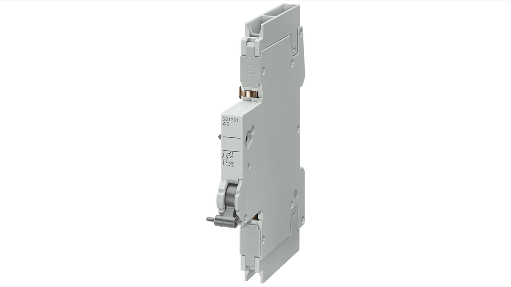 Contatto ausiliario Siemens, 2 contatti, 2 NA, serie 5ST3. Tensione nominale d'esercizio 440 V, grado di protezione IP20, temperatura d'esercizio -40 °C a 70 °C. Dimensioni: larghezza 9 mm, altezza 110 mm, profondità 70 mm. Prodotto della serie Sentron. Codice costruttore 5ST3011-0HG.