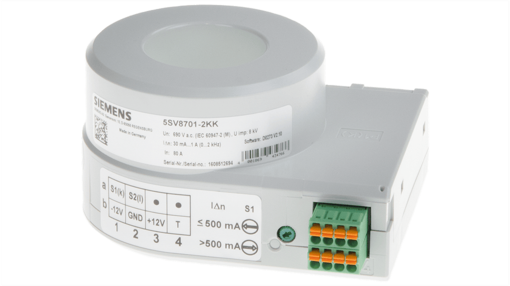 Trasformatore di corrente Siemens, foro 35mm, serie 5SV8, corrente residua minima 10 mA, design tipo B, collegamento elettrico a terminale a innesto, grado di protezione IP20, temperatura operativa da -10 a 55 gradi Celsius, tensione di alimentazione 12 V, altezza complessiva 55 mm, larghezza complessiva 99.5 mm. Codice costruttore 5SV8701-2KK.