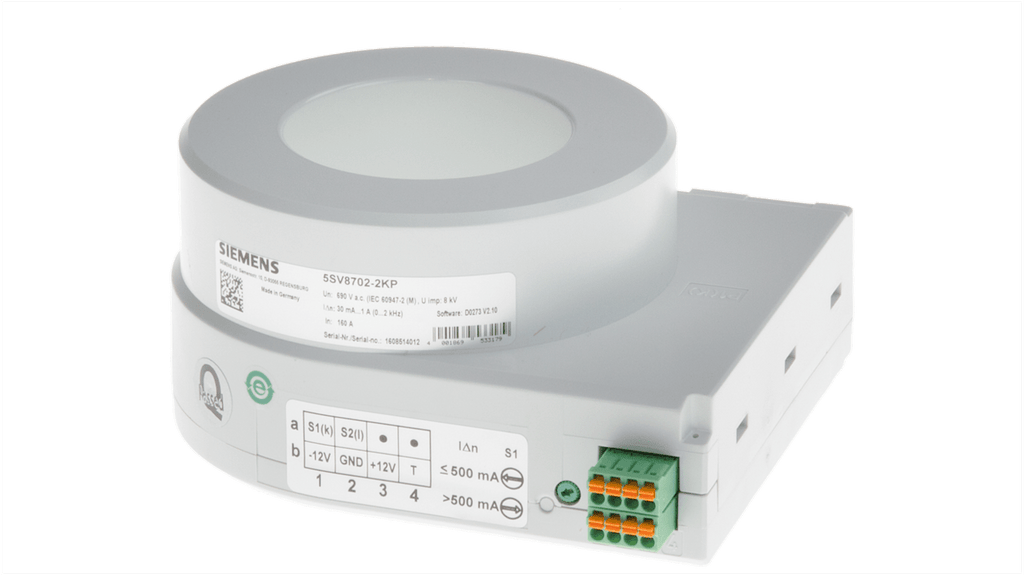 Trasformatore di corrente Siemens, foro 60mm, serie 5SV8, corrente residua minima 10 mA, design tipo B, collegamento elettrico a terminale a innesto, grado di protezione IP20, temperatura operativa da -10 a 55 gradi Celsius, tensione di alimentazione 12 V, altezza complessiva 67 mm, larghezza complessiva 135 mm. Codice costruttore 5SV8702-2KK.