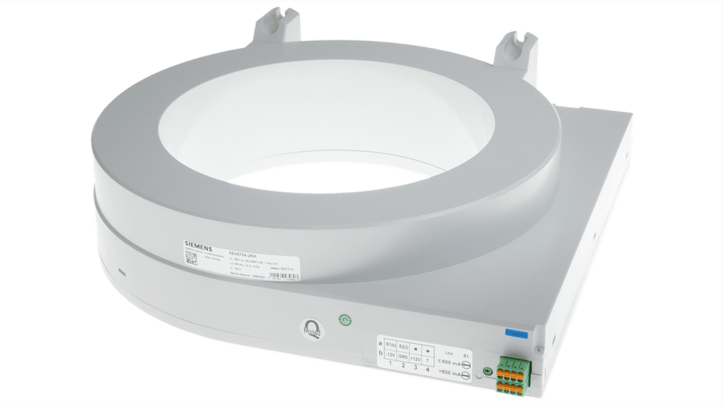 Trasformatore di corrente Siemens, foro 210mm, serie 5SV8, corrente residua minima 300 mA, design di tipo B, collegamento elettrico a terminale a innesto, grado di protezione IP20, temperatura operativa da -10 a +55 gradi Celsius, tensione di alimentazione 12 V, altezza complessiva 80 mm, larghezza complessiva 323 mm. Codice costruttore 5SV8704-2KK.
