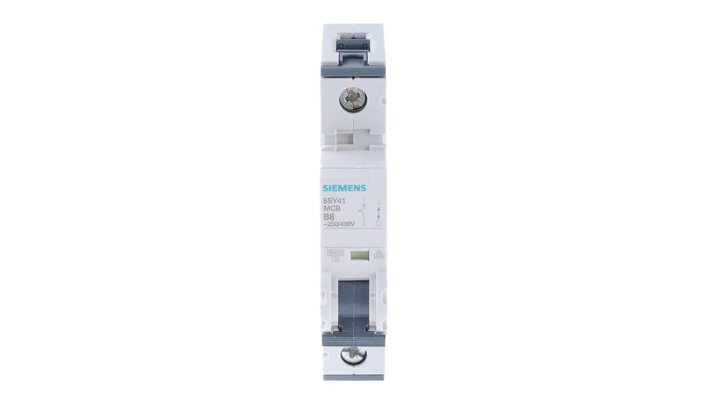 Interruttore magnetotermico Siemens 1P 6A 10 kA, Tipo B, tensione nominale 400 V, capacità di interruzione 10 kA, serie 5SY4, tipo MCB, montaggio guida DIN, larghezza 17.5 mm, lunghezza 89.8 mm, profondità 76 mm, conforme a standard EN 60898, DIN VDE 0641, IEC 60898.