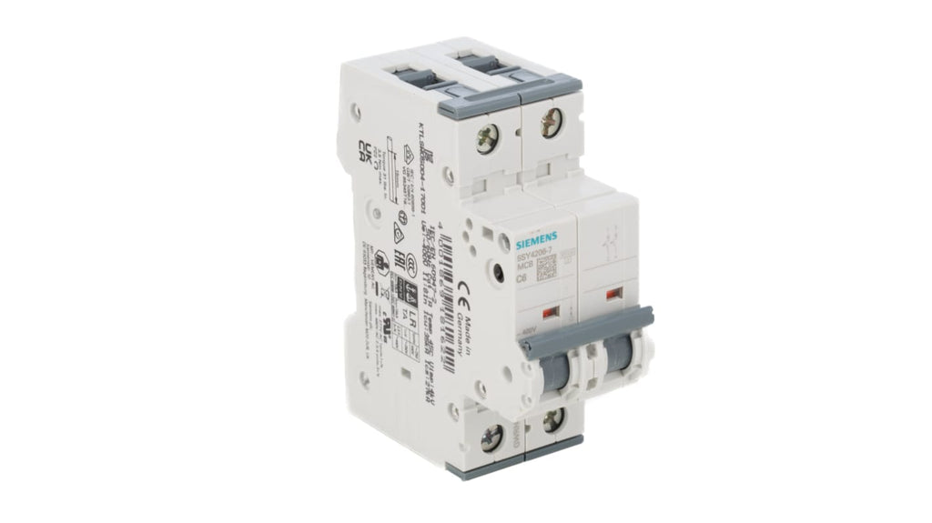 Interruttore magnetotermico Siemens, 2 poli, 6 A, Tipo C, tensione nominale 400 V, capacità di rottura 10 kA, gamma di temperatura da -40 a +70 gradi Celsius, montaggio su guida DIN, larghezza 36 mm, lunghezza 90 mm, profondità 76 mm, vita meccanica 10.000 cicli, grado di protezione IP20, tolleranza umidità fino al 95%. Serie Sentron, codice costruttore 5SY4206-7.