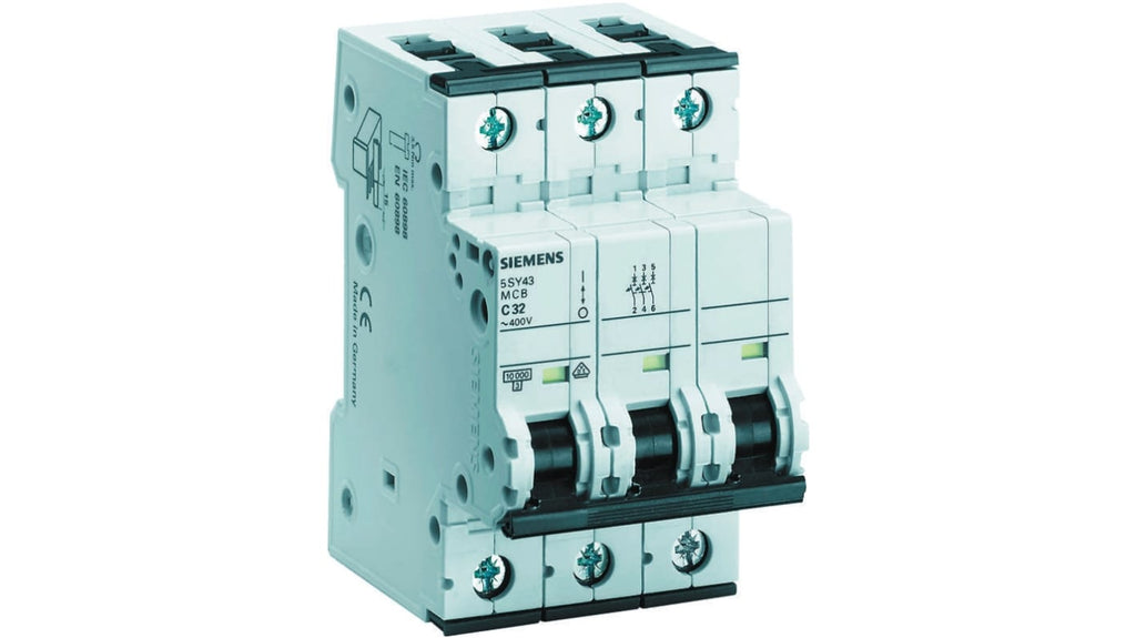 Interruttore magnetotermico Siemens 3 poli, 1A, Tipo C, capacità di rottura 10 kA, tensione nominale 400V, montaggio su guida DIN, serie 5SY4, standard IEC 60898. Dimensioni: lunghezza 89.8mm, larghezza 53mm, profondità 76mm. Progettato per applicazioni industriali e residenziali, offre interruzione automatica e opzioni di montaggio innovative.
