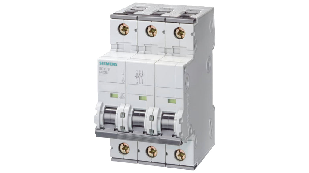 Interruttore magnetotermico Siemens 3 poli, 4A, Tipo D, capacità di rottura 10 kA, tensione nominale 400V, montaggio su guida DIN, serie 5SY4, conforme alla norma IEC 60898. Dimensioni: lunghezza 89.8mm, larghezza 53mm, profondità 76mm. Caratteristiche di intervento B, C e D per diverse applicazioni industriali e residenziali. Assemblato per una rimozione rapida e conveniente.