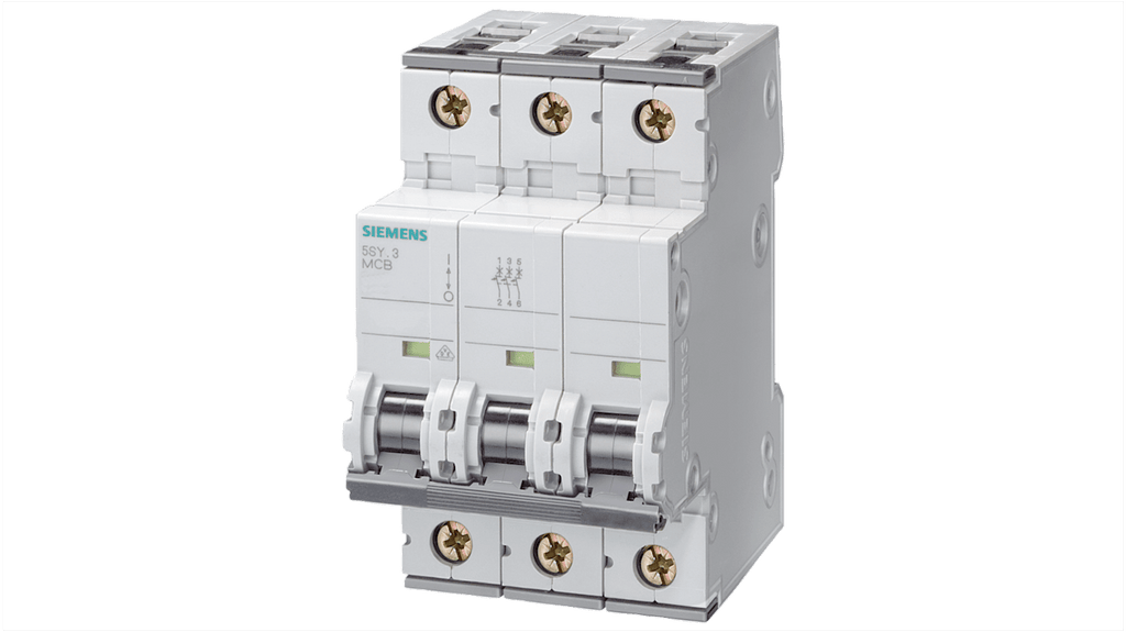 Interruttore magnetotermico Siemens 3P 6A, Tipo A, 400 V, ICN 10 kA, ICU 35 kA, montaggio guida DIN, serie 5SY, gamma SENTRON. Interrompe in modo sicuro il circuito, protegge installazioni elettriche e apparecchiature. Design uniforme, possibilità di espansione con accessori.