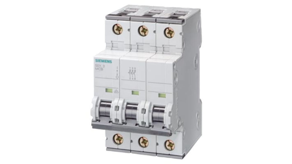 Interruttore magnetotermico Siemens, 3 poli, 6 A, Tipo C, tensione nominale 400 V c.a., capacità di interruzione 10 kA, montaggio su guida DIN, dimensioni 53 x 89,8 x 76 mm, gamma di temperature da -25 a +55 gradi, adatto per applicazioni commerciali e residenziali, modello 5SY4306-7, serie SENTRON.