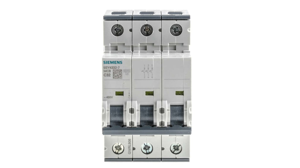 Interruttore magnetotermico Siemens 3P 32A 10 kA, Tipo C, tensione nominale 400 V, capacità di interruzione 10 kA, serie 5SY4, montaggio guida DIN, dimensioni 89.8 mm x 53 mm x 76 mm, conforme a standard EN 60898, DIN VDE 0641, IEC 60898.