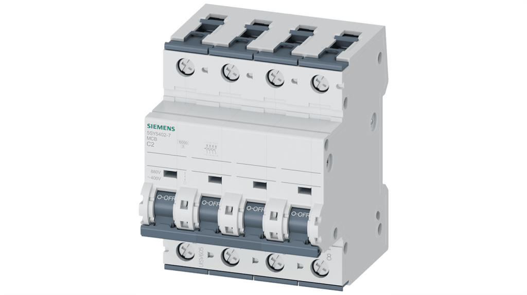 Interruttore magnetotermico Siemens 4P 2A, Tipo C, 400 V, ICN: 10 kA, montaggio guida DIN, serie 5SY, gamma SENTRON. Interrompe in modo sicuro il circuito, protegge installazioni elettriche e apparecchiature. Design uniforme, possibilità di espansione con accessori. Amperaggio 2A, caratteristica di intervento Tipo C.
