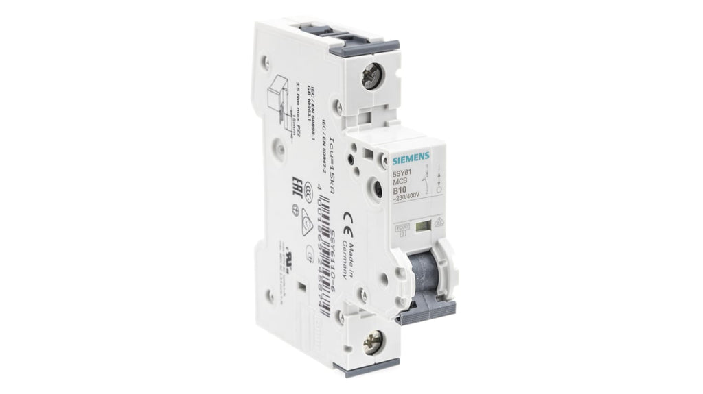 Interruttore automatico magnetotermico, 1P, 10A, Tipo B, tensione nominale 230V/400V, capacità di rottura 6 kA, montaggio su guida DIN, morsetti simmetrici, collegamento rapido della linea di alimentazione, piombabile in posizione di presa, conforme a EN 60898, VDE 0641 parte 11, IEC 60898, dimensioni 89.8mm x 17.5mm x 76mm. Codice costruttore 5SY6110-6, marchio Siemens.