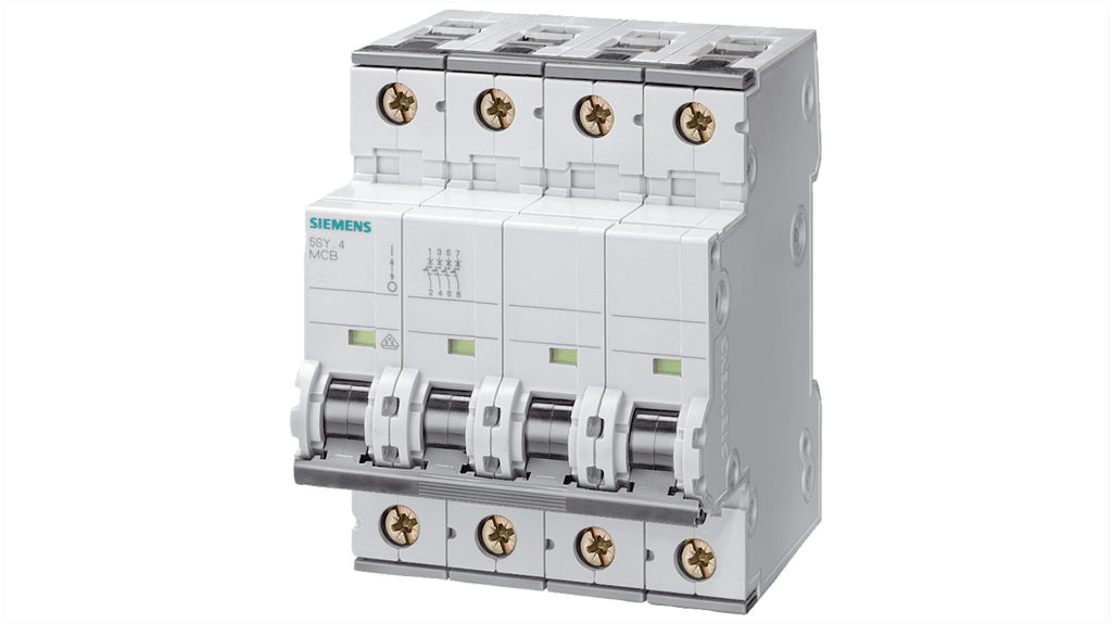 Interruttore magnetotermico Siemens, 3P+N, 32A, Tipo B, tensione 400 V, ICN 6 kA, ICU 15 kA, montaggio guida DIN, serie 5SY, gamma SENTRON. Progettato per interrompere circuiti e proteggere installazioni elettriche. Design uniforme, espandibile con accessori.