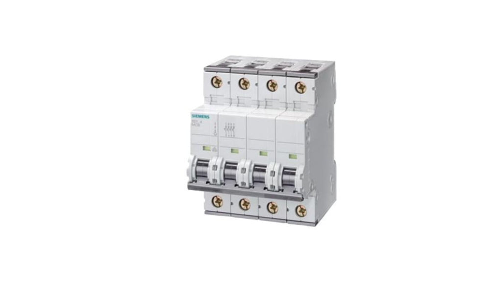 Interruttore magnetotermico 4 poli, 32 A, Tipo C, tensione nominale 400 V c.a. e 72 V c.c., capacità di commutazione 15 kA, conforme a EN 60898 e EN 60204-1, senza alogeni, montaggio su guida DIN, dimensioni 72 mm x 76 mm x 90 mm, codice costruttore 5SY7432-7, marchio Siemens.