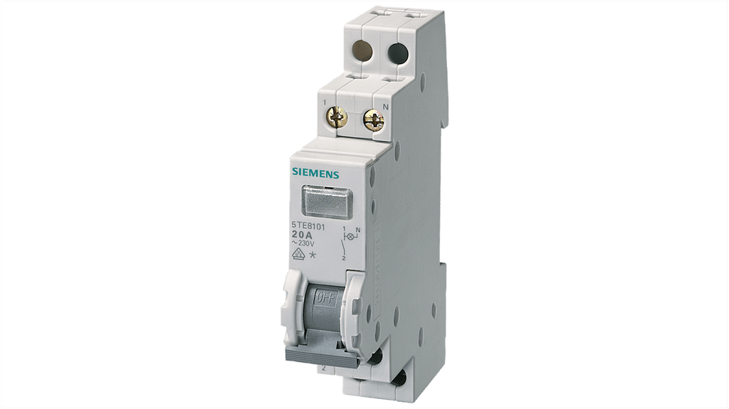 Interruttore sezionatore Siemens 5TE8102 serie Sentron, 2 poli, corrente massima 20A, configurazione 2 contatti normalmente aperti. Prodotto per applicazioni in impianti industriali, centri dati e quadri elettrici. Contatti a lama piatta scanalata, progettato per garantire sicurezza ed efficienza nella distribuzione dell'alimentazione.