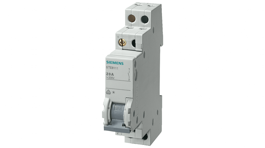 Interruttore di isolamento Siemens 5TE8114, 1P, 20A, montaggio su guida DIN. Progettato per commutazione di piccoli carichi on/off, compatibile con sistemi Sentron. Accessori standardizzati, tecnologia di collegamento intuitiva. Ideale per armadietti di controllo e morsettiere di distribuzione. Specifiche: numero di poli 1P, corrente massima 20A, tipo di montaggio guida DIN.