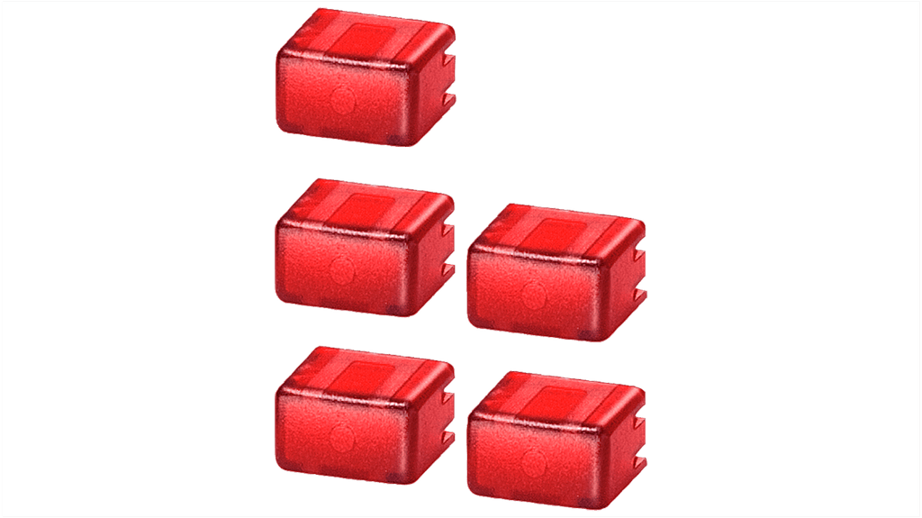 Coperchio pulsante per uso con pulsante serie 5TE48. Set composto da 5 tappi rosso-trasparenti. Marchio Siemens, codice costruttore 5TG8061. Accessorio progettato per garantire compatibilità e funzionalità con i pulsanti specificati.