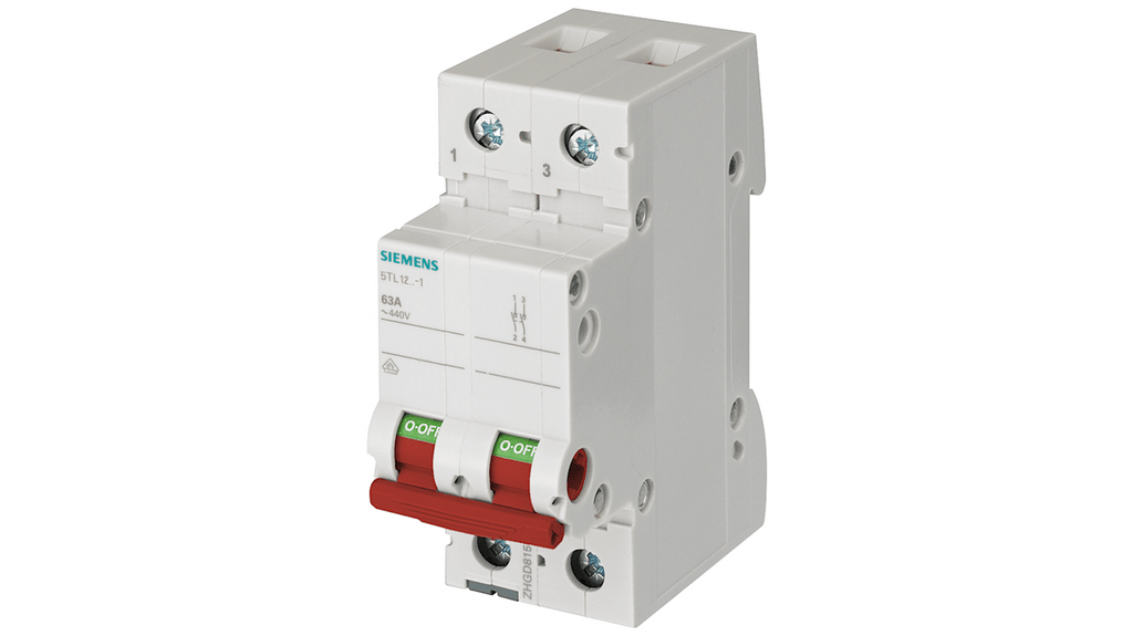 Interruttore di isolamento a due poli, corrente massima 100A, serie 5TL. Montaggio su guide standard, progettato per il controllo di impianti elettrici. Accessori standardizzati, tecnologia di collegamento facile da usare, design integrato. Utilizzato in armadietti di controllo e morsettiere di distribuzione per la commutazione di piccoli carichi. Compatibile con applicazioni infrastrutturali e industriali.