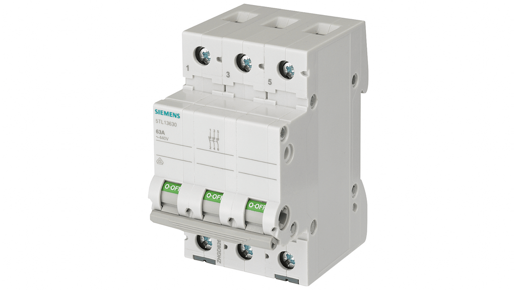 Interruttore di isolamento Siemens, 3 poli, corrente massima 80A, serie 5TL. Dispositivo di commutazione a due vie per montaggio su guide standard, progettato per il controllo di impianti elettrici. Caratteristiche: tecnologia di montaggio e collegamento facile, accessori standardizzati, design integrato. Utilizzato in armadietti di controllo e morsettiere di distribuzione per la commutazione di piccoli carichi.