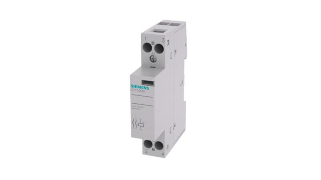 Contattore Siemens, serie 5TT, 2 poli, 2 NO, 20 A, bobina 24 V ca/cc. Tensione nominale contatto 230 V ca, montaggio su guida DIN, tipo terminale a vite. Dimensioni: larghezza 90 mm, lunghezza 17.5 mm, profondità 70.7 mm. Conforme alla norma EN 60947, omologato UL 508. Configurazione DPST, funzione automatica O/I, indicazione posizione di commutazione.