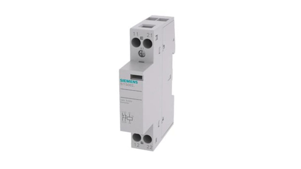 Contattore Siemens, serie 5TT, 2 poli, 2NC, 20 A, bobina 24V c.a./c.c., tensione nominale contatto 230 V ca, montaggio su guida DIN, tipo terminale a vite, dimensioni 35 mm x 90 mm x 70.7 mm, conforme alla norma EN 60947, omologato a norma UL 508, configurazione DPST, funzione automatica O/I, indicazione della posizione di commutazione.