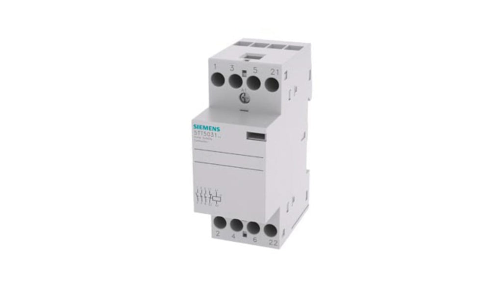 Contattore Siemens, serie 5TT, 4 poli, 3NO + 1NC, corrente nominale 24 A, tensione bobina 24 V ca/cc, tensione nominale contatto 400 V c.a., montaggio su guida DIN, tipo terminale a vite, dimensioni 35 mm (lunghezza) x 90 mm (larghezza) x 70.7 mm (profondità), conforme alla norma EN 60947 e omologato a norma UL 508.