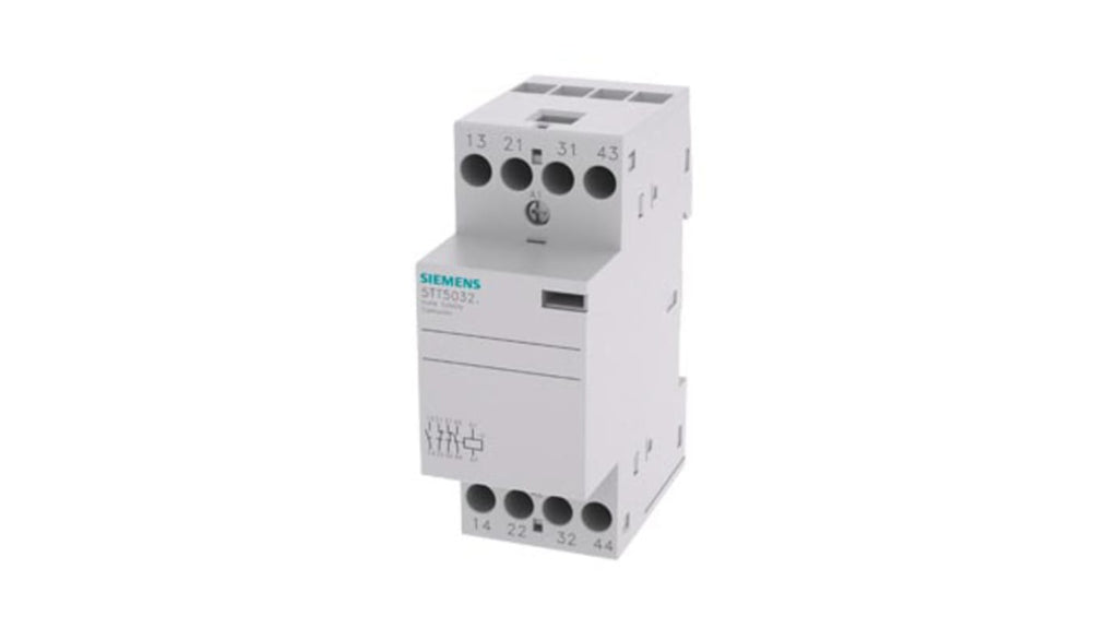 Contattore Siemens, serie 5TT, 4 poli, 2 NO + 2 NC, 24 A, bobina 24 V ca/cc. Tensione nominale contatto 400 V c.a., montaggio su guida DIN, tipo terminale a vite. Dimensioni: larghezza 90 mm, lunghezza 35 mm, profondità 70.7 mm. Conforme alla norma EN 60947, omologato a norma UL 508. Configurazione polo e corsa 4PST. Funzione automatica O/I, indicazione posizione di commutazione.