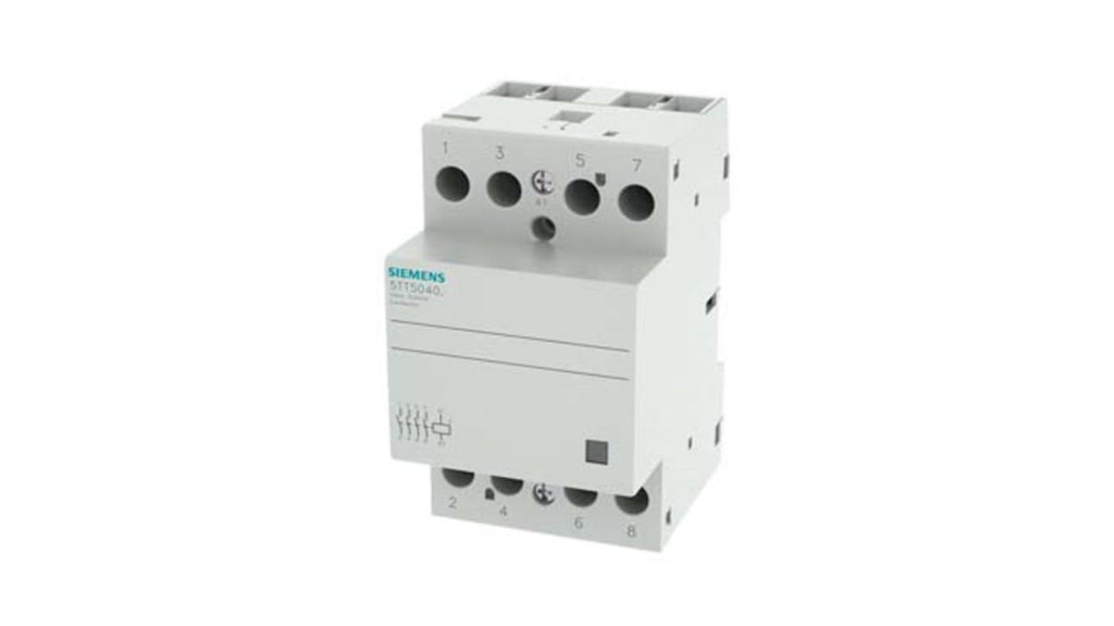 Contattore Siemens, serie 5TT, 4 poli, 4NO, 40 A, bobina 24 V ca/cc. Tensione nominale contatto 400 V c.a., montaggio su guida DIN, tipo terminale a vite. Dimensioni: lunghezza 53.5 mm, larghezza 90 mm, profondità 70.7 mm. Conforme alla norma EN 60947, omologato UL 508. Funzione automatica O/I, indicazione della posizione di commutazione. Configurazione polo e corsa 4PST.