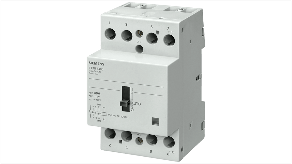 Contattore per commutazione condensatore, 3 contatti NA e 1 contatto NC, corrente nominale 40 A, potenza nominale 4 kW, tensione bobina 24 V. Approvazione EAC, certificazione CE. Configurazione stato normale 3 NA/1 NC, progettato per carichi capacitivi elevati. Marchio Siemens, codice costruttore 5TT5841-8.