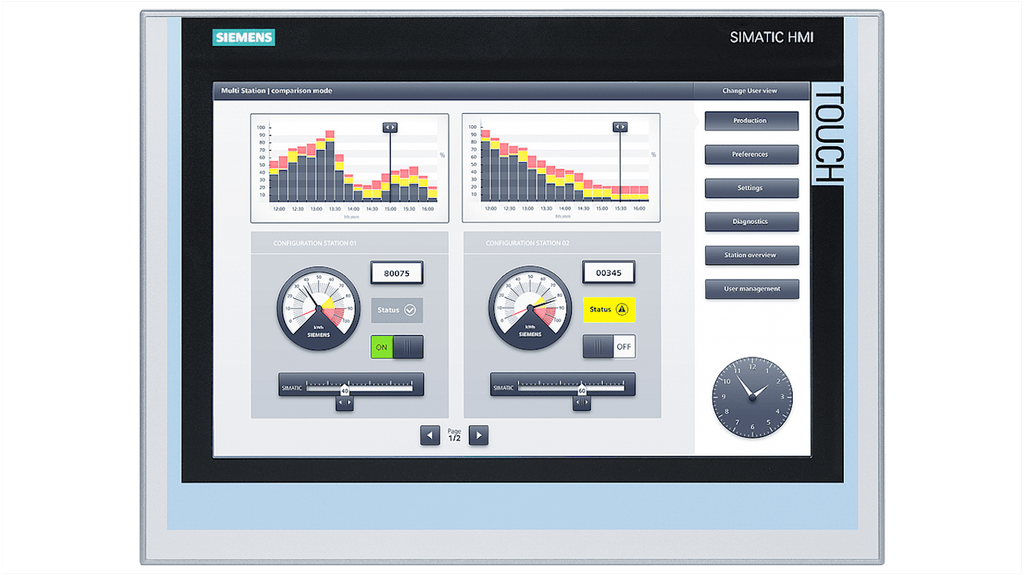 Pannello HMI Siemens, TP1500 Comfort, 15,4 in, serie SIPLUS, display TFT. Risoluzione 1280 x 800 pixels, interfacce PROFINET, MPI, PROFIBUS DP, memoria di configurazione 24 MB, funzionamento tattile, rivestimento conforme. Codice costruttore 6AG11240QC024AX1.