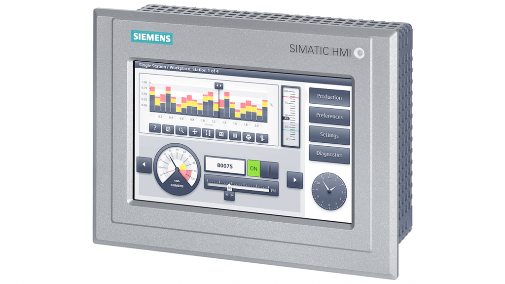 Pannello HMI per esterni, Siemens SIPLUS TP700, display TFT da 7 pollici, risoluzione 800 x 480 pixel, interfacce PROFINET, MPI e PROFIBUS DP, memoria di configurazione 12 MB, temperatura d'esercizio da -30 a +60 gradi Celsius, rivestimento conforme per ambienti esterni. Codice produttore 6AG21240GC131AX0.