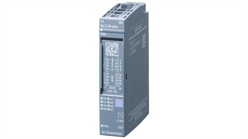 Modulo di ingresso analogico per ET 200SP, tensione di funzionamento 24 V c.c., diagnostica integrata, isolamento testato 750 V c.c., rivestimento protettivo classe PC2 secondo EN 50155:2017, dimensioni 73 x 15 x 58 mm, codice costruttore 6AG21346GF004AA1, compatibile con BU tipo A0, A1, codice colore CC01.