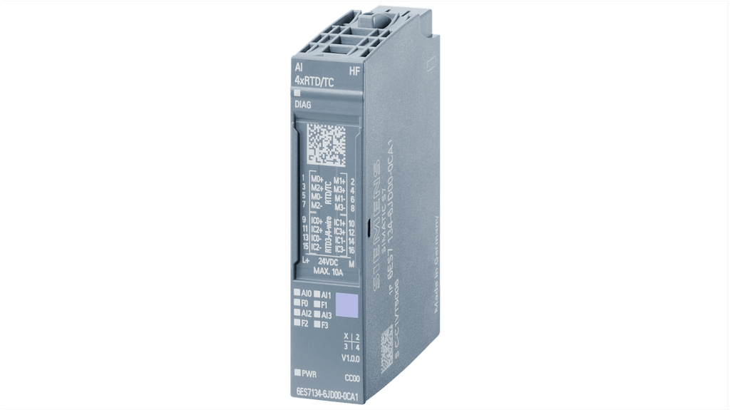 Modulo di ingresso analogico per ET 200SP, modello SIPLUS ET 200SP AI 4xRTD/TC HF, codice 6AG21346JD001CA1, diagnostica canali, risoluzione 16 bit, precisione +/-0,2%, configurazione 2/3/4 fili, isolamento testato 750 V c.c., dimensioni 73 x 15 x 58 mm, codice colore CC00, compatibile con BU tipo A0, A1.