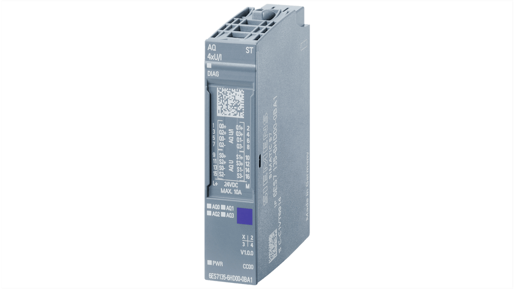 Modulo di distribuzione di potenza Siemens, serie 6AG213, per ET 200SP, codice costruttore 6AG21356HD004BA1. Modulo uscita analogico, tensione di funzionamento 24 V, diagnostica del modulo integrata, monitoraggio della tensione di alimentazione. Dimensioni 73 x 15 x 58 mm, colore CC00, compatibile con BU tipo A0, A1.